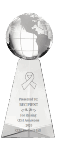 The CDH patient with the most ribbons this year wins this crystal trophy! The trophy winner will be announced live on April 30th. Thank you to Key Printing for sponsoring this prize.